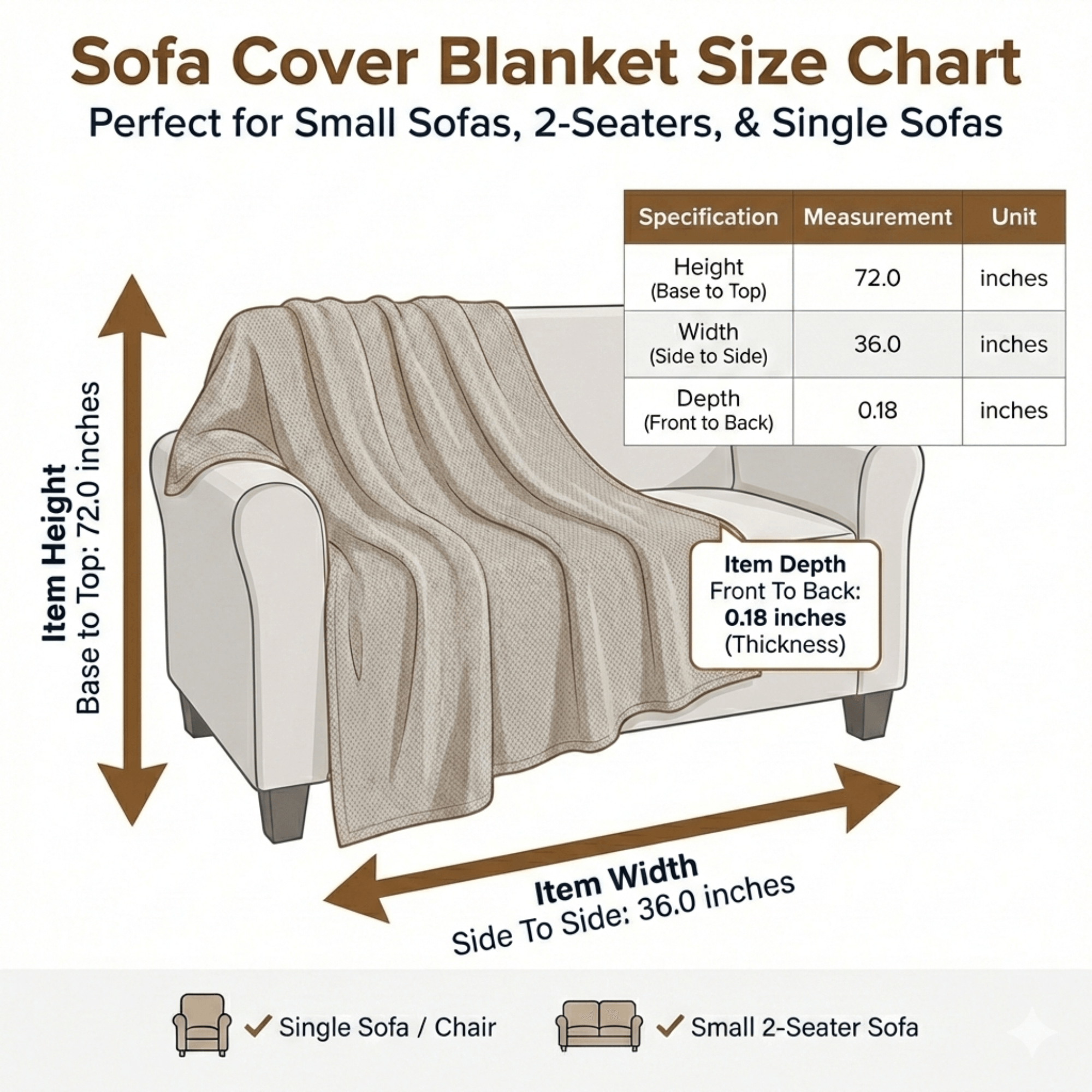 • Product Dimensions – This two sectional couch blanket cover measures 36″ wide by 72″ high with a 0.18″ depth. These dimensions make it a perfect two seated sofa blanket cover that is lightweight, warm, and easy to drape.