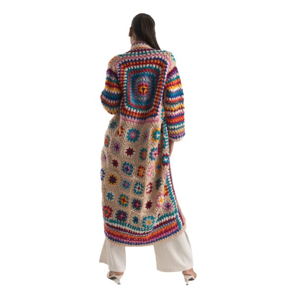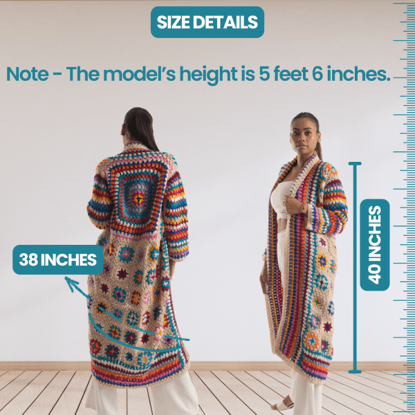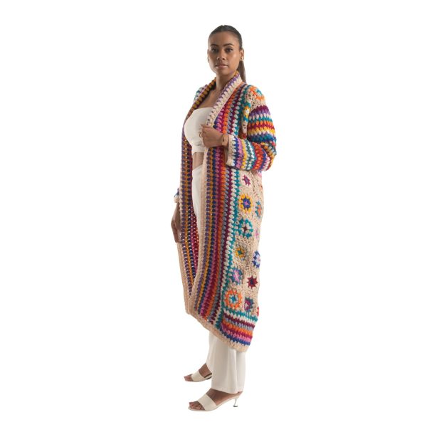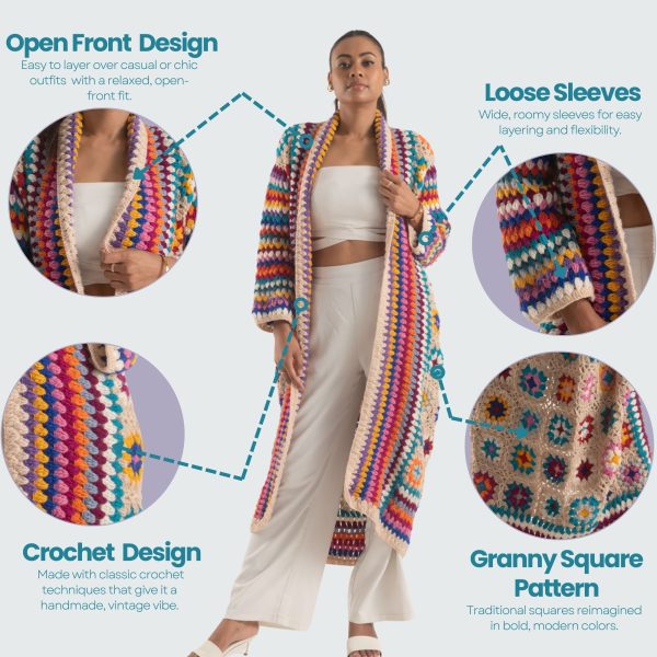 Boho Design – This wool cardigan for women features a vibrant color palette with an open-front silhouette and long sleeves for a relaxed, effortless look. The detailed floral crochet pattern gives it vintage charm, making it a statement wool duster cardigan, longline wool cardigan, and bohemian outer layer for modern wardrobes.