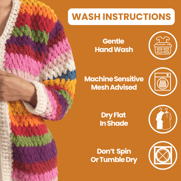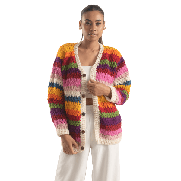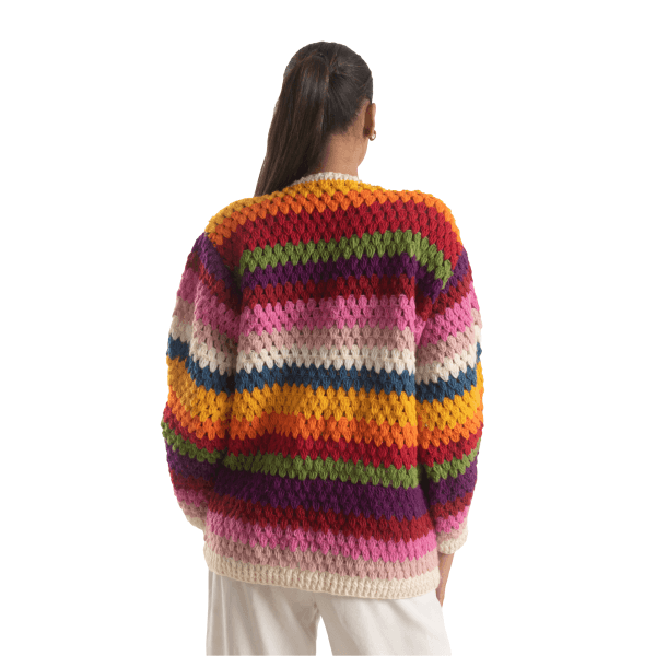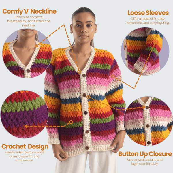 Premium Wool Quality – Made from 100% breathable sheep wool, this women’s woolen sweater is carefully handknitted in Nepal. It features a chunky granny crochet pattern that feels warm yet lightweight. Because of its natural fibers, this wool cardigan for women provides comfort without irritation. Moreover, this wool cardigan sweater is ideal for winter, fall, and cool spring days.