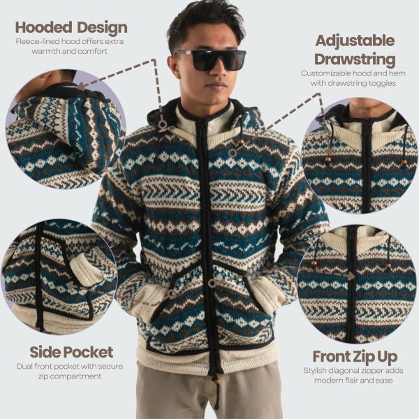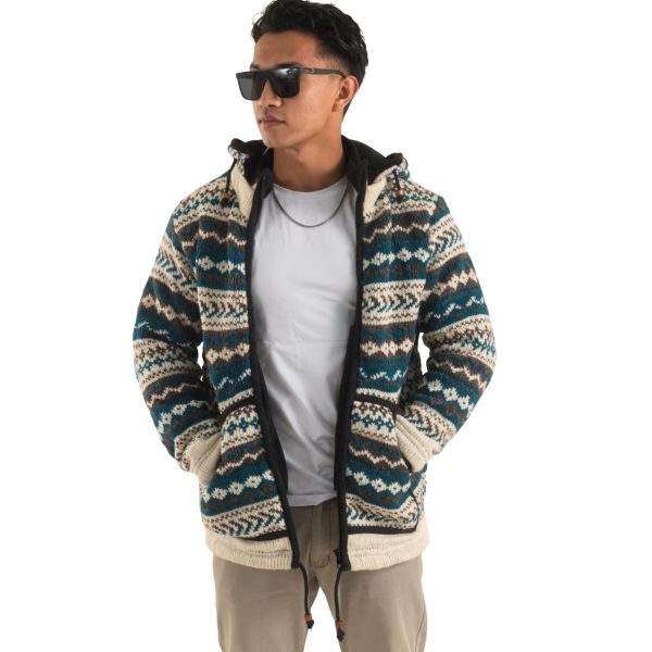 Wool Jacket For Women & Men – Unisex Blue Nordic Pattern Fleece Lined – Made in Nepal