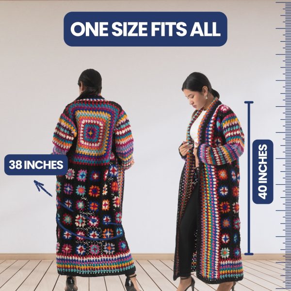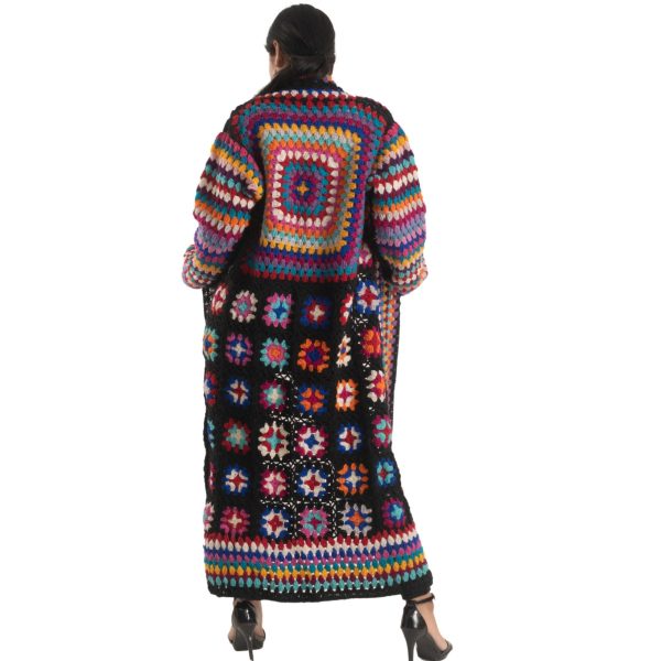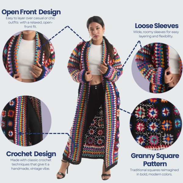 Boho Design – This wool cardigan for women features a vibrant color palette with an open-front silhouette and long sleeves for a relaxed, effortless look. The detailed floral crochet pattern gives it vintage charm, making it a statement wool duster cardigan, longline wool cardigan, and bohemian outer layer for modern wardrobes.