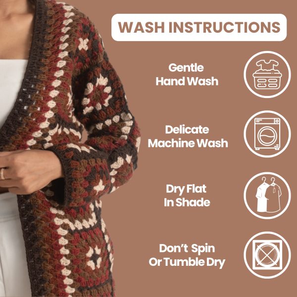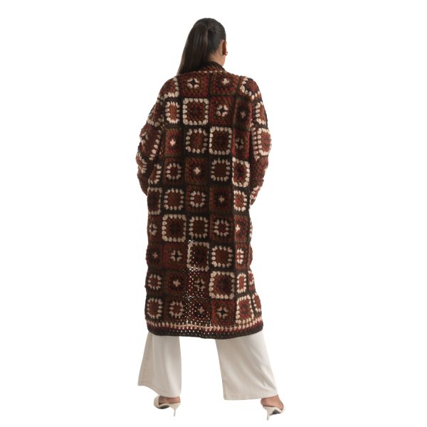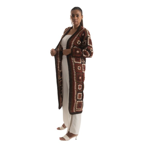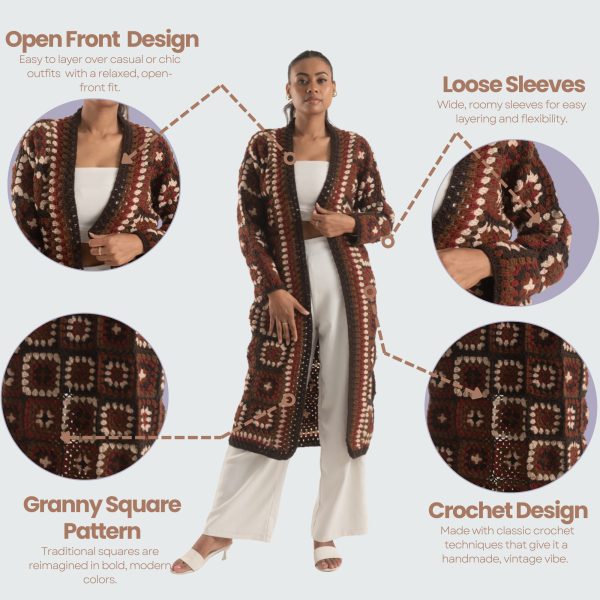 Boho Design – This wool cardigan for women features a vibrant color palette with an open-front silhouette and long sleeves for a relaxed, effortless look. The detailed floral crochet pattern gives it vintage charm, making it a statement wool duster cardigan, longline wool cardigan, and bohemian outer layer for modern wardrobes.